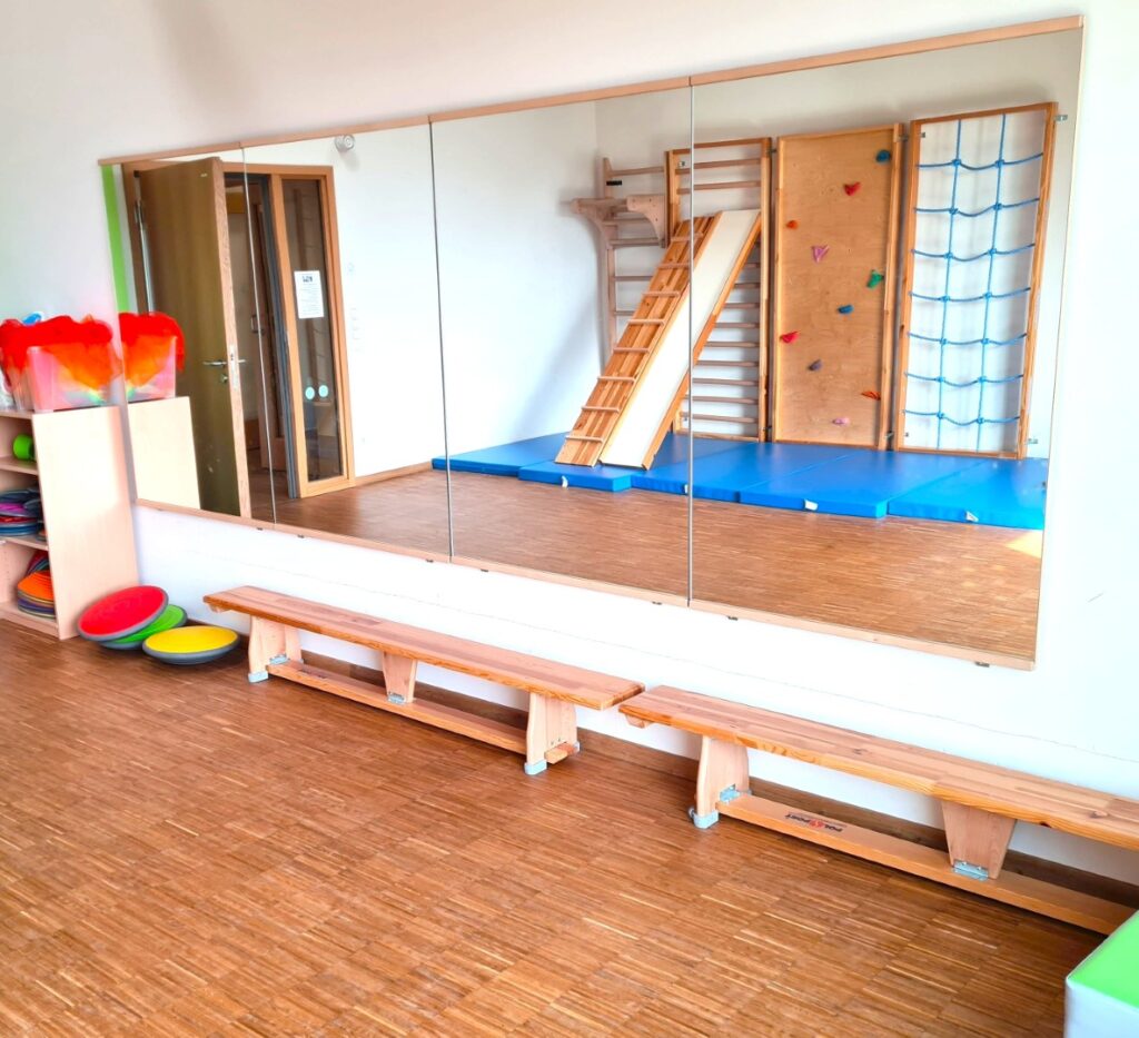 Unser Bewegungsraum ist ausgestattet mit einer Sprossenwand, verschiedenen Kletterwänden und einem Turnpodest, das durch unterschiedliche Einhänge oder Bewegungselemente ergänzt werden kann.