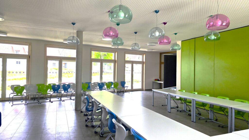Für Veranstaltungen kann die Trennwand zwischen Mensa und Kunstraum verschoben werden und so genügend Platz für alle vier Klassen bieten.